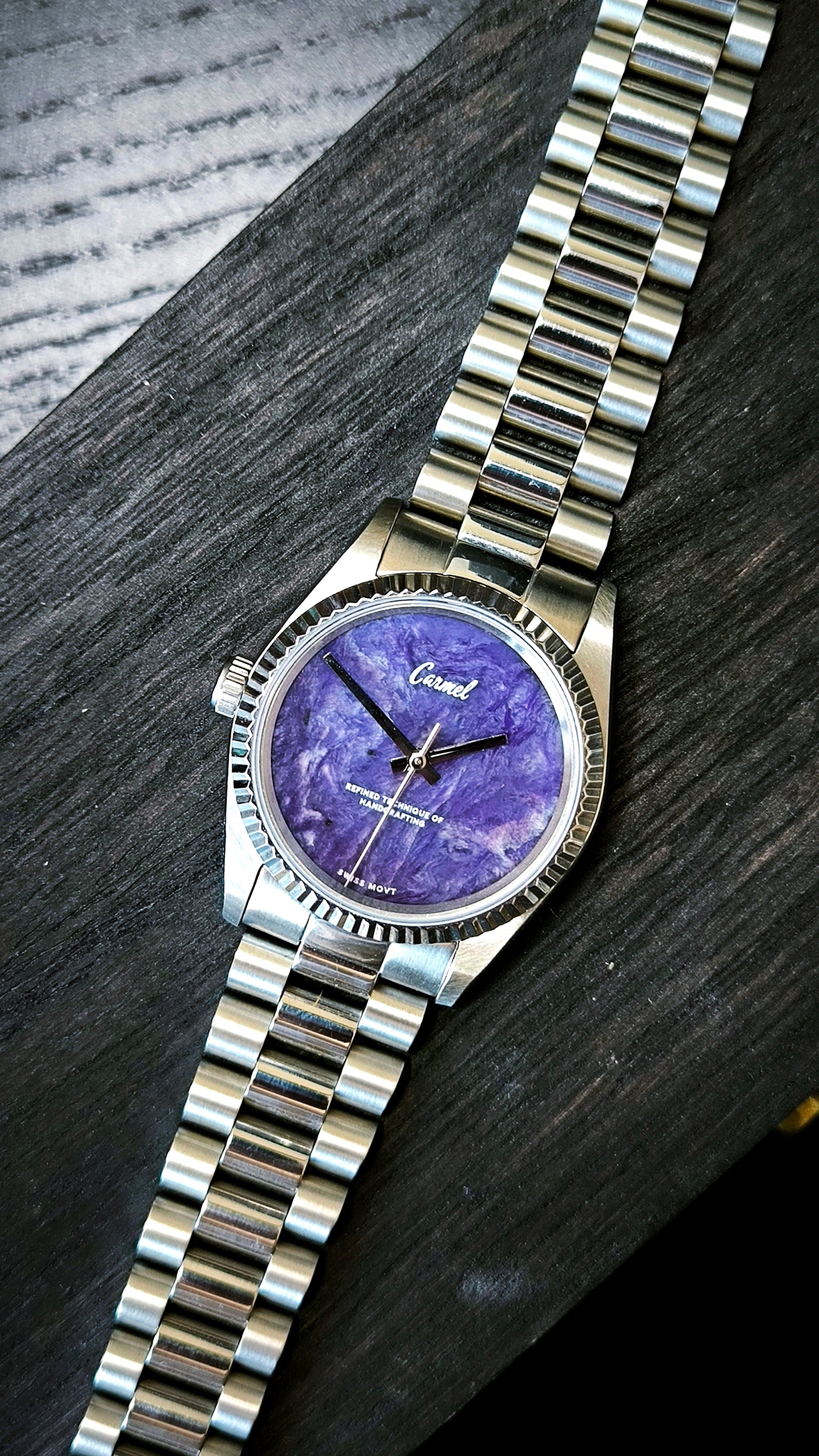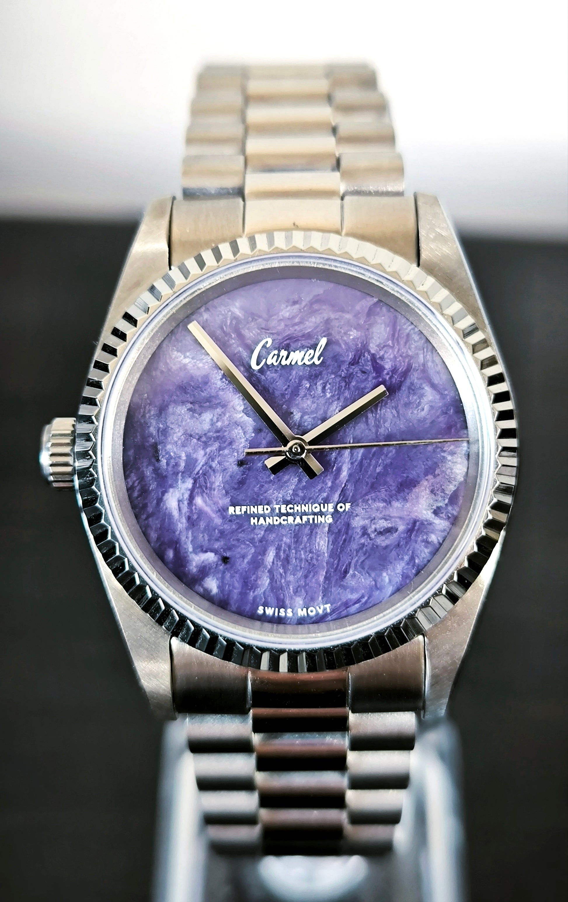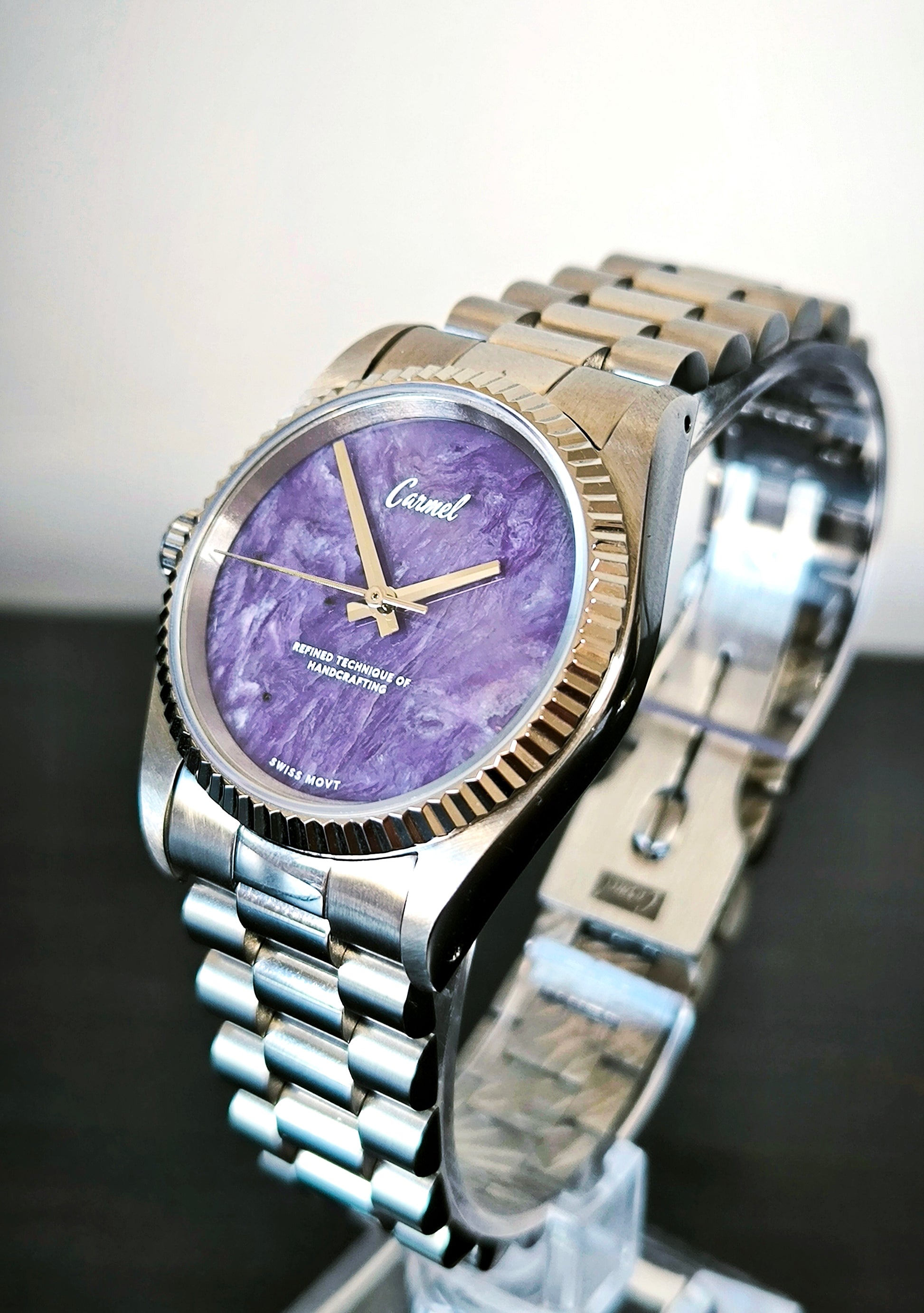 Its dial is crafted from natural charoite stone, manually finished in my workshop. This rare gem, sourced from Siberia, is celebrated for its deep violet swirls and iridescent, silky reflections that seem to move with the light. Each stone is carefully selected for its most captivating patterns and balance of hues, making every dial truly one of a kind.