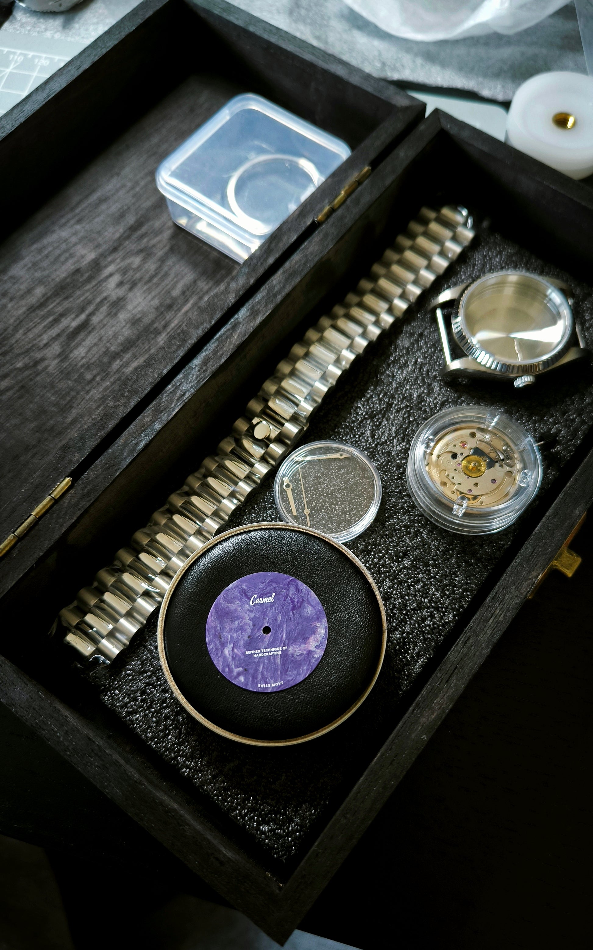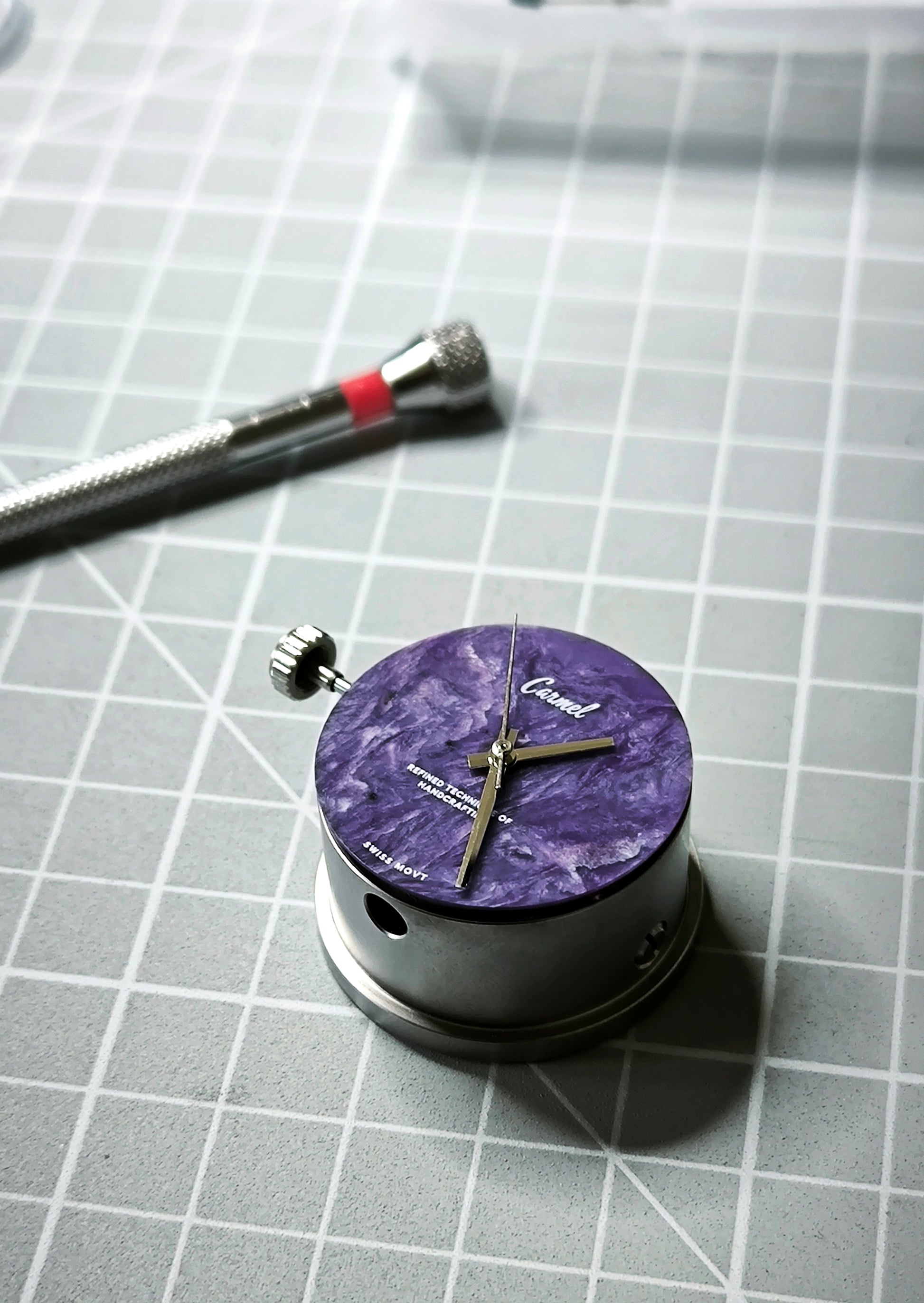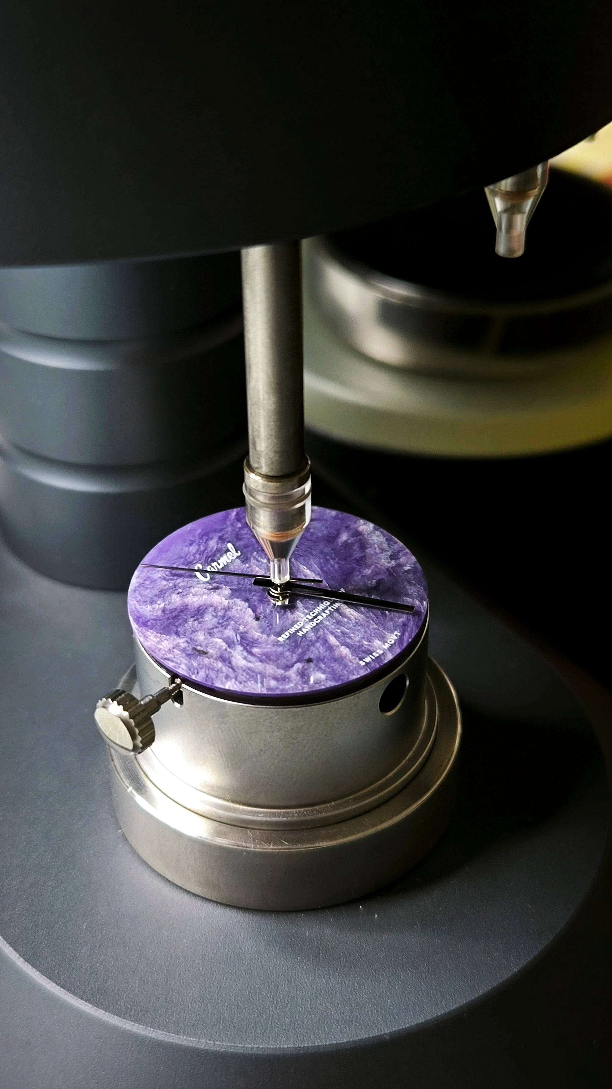 Its dial is crafted from natural charoite stone, manually finished in my workshop. This rare gem, sourced from Siberia, is celebrated for its deep violet swirls and iridescent, silky reflections that seem to move with the light. Each stone is carefully selected for its most captivating patterns and balance of hues, making every dial truly one of a kind.