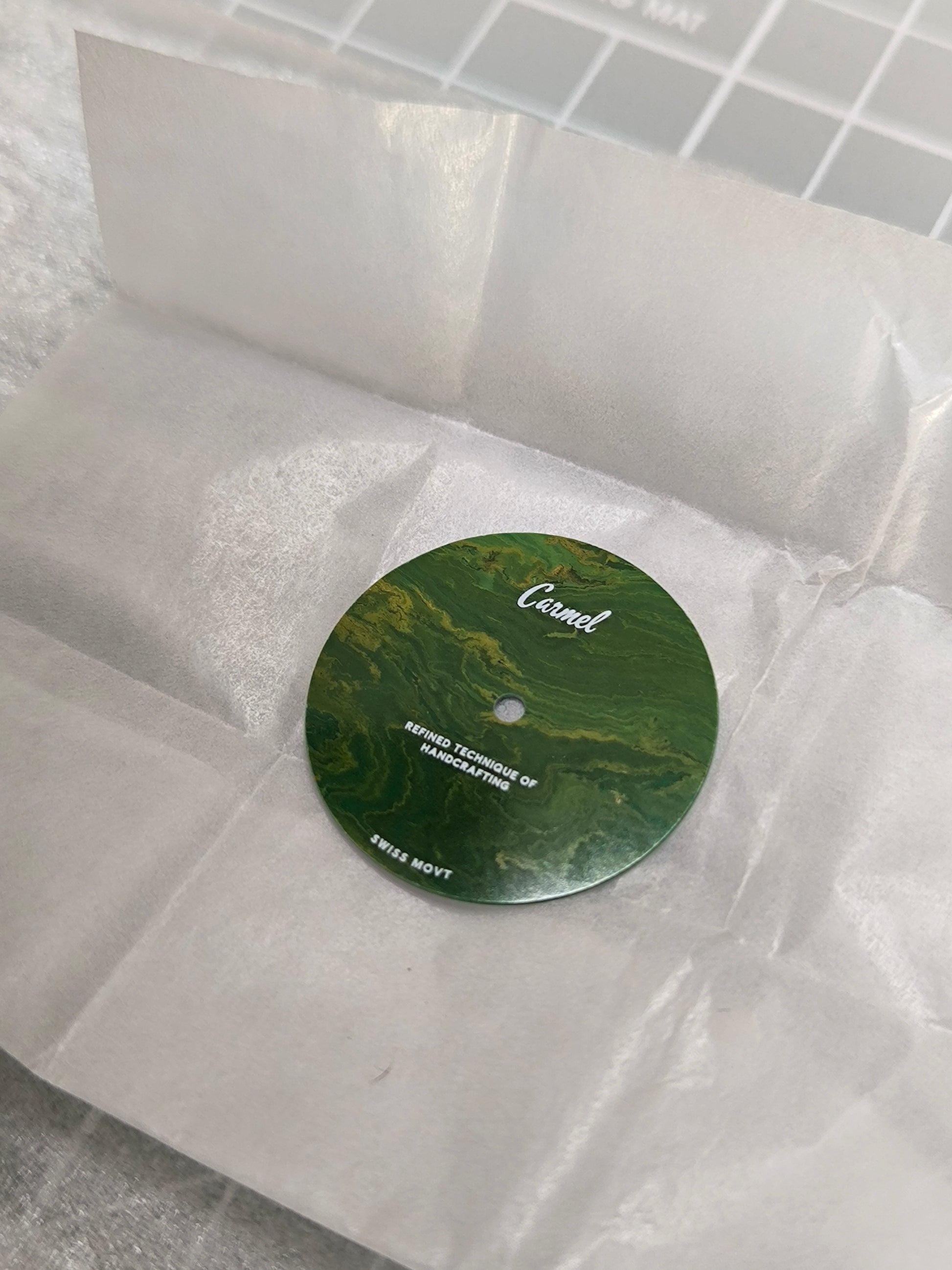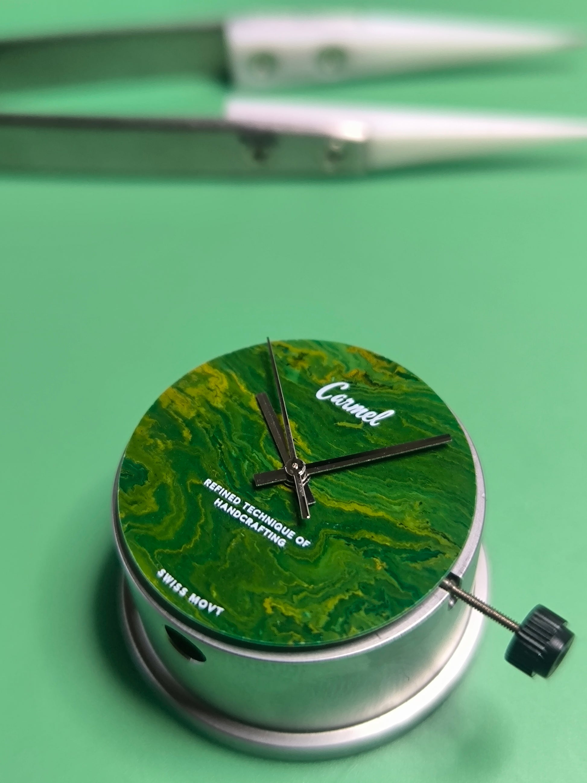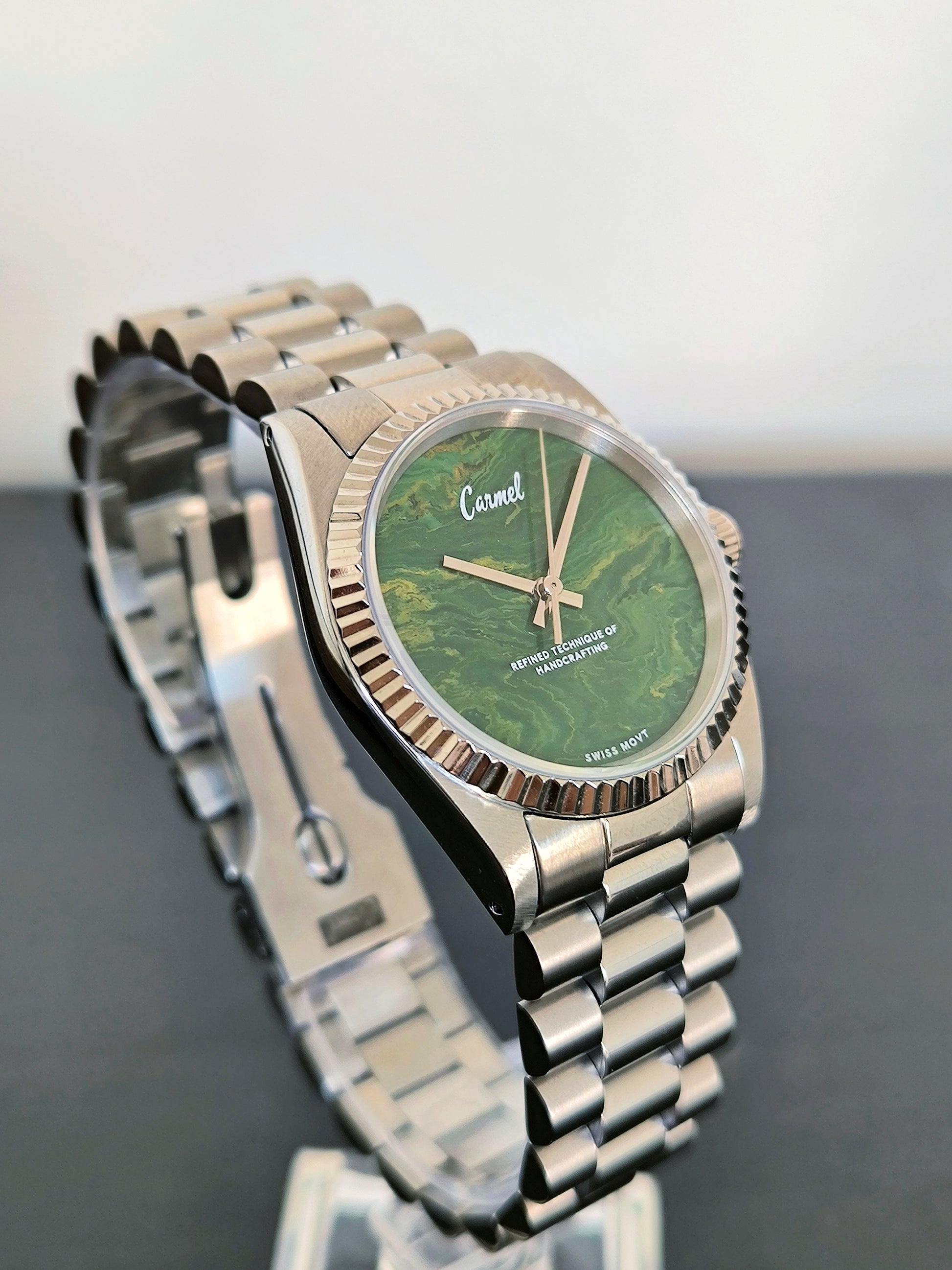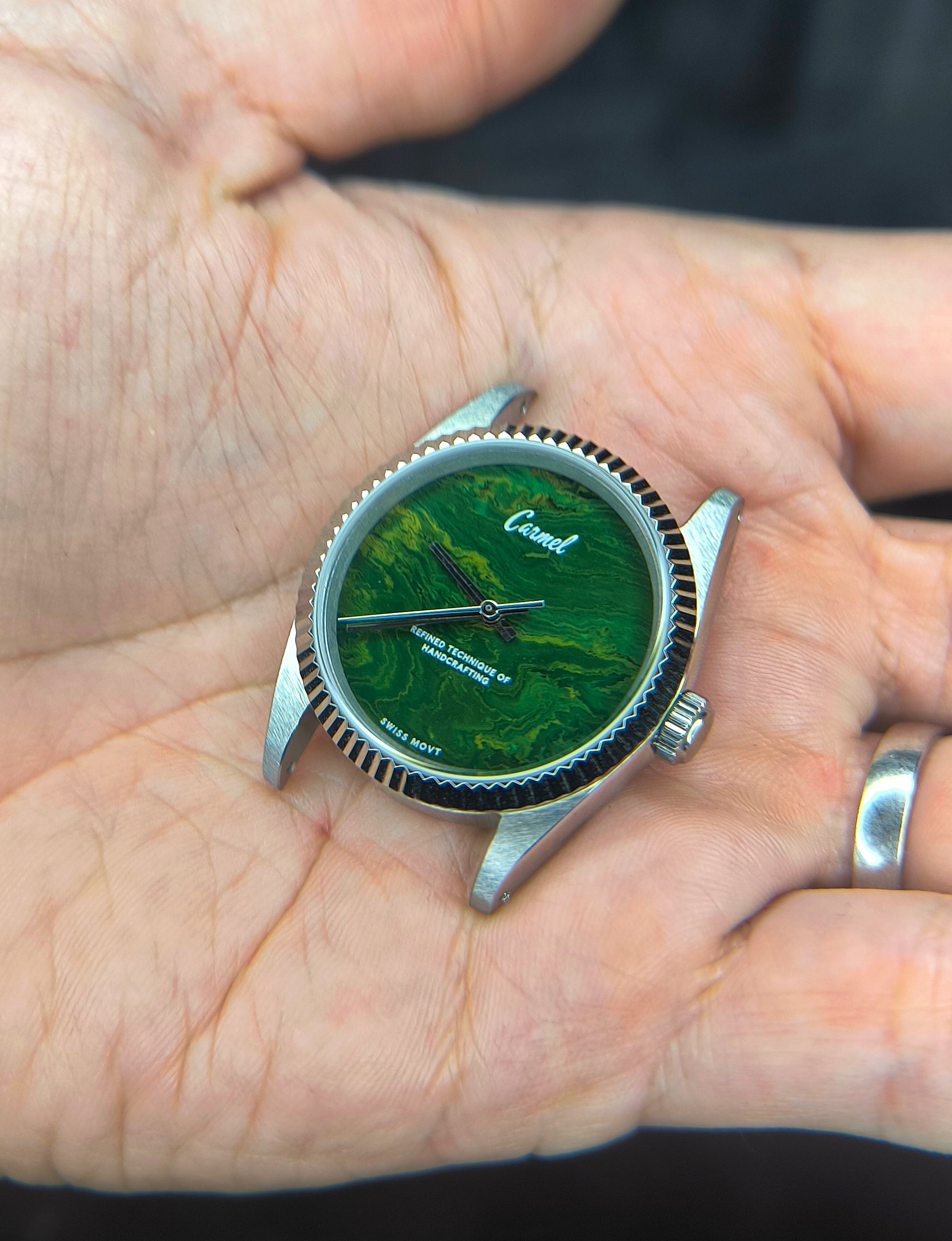 Its dial is crafted from natural muscovite, manually finished in my workshop. This rare gem is renowned for its vibrant green tones and shimmering reflections. The natural veins within the stone create delicate variations and depth, evoking the brushstrokes of an impressionist painting, making each dial truly one of a kind.
