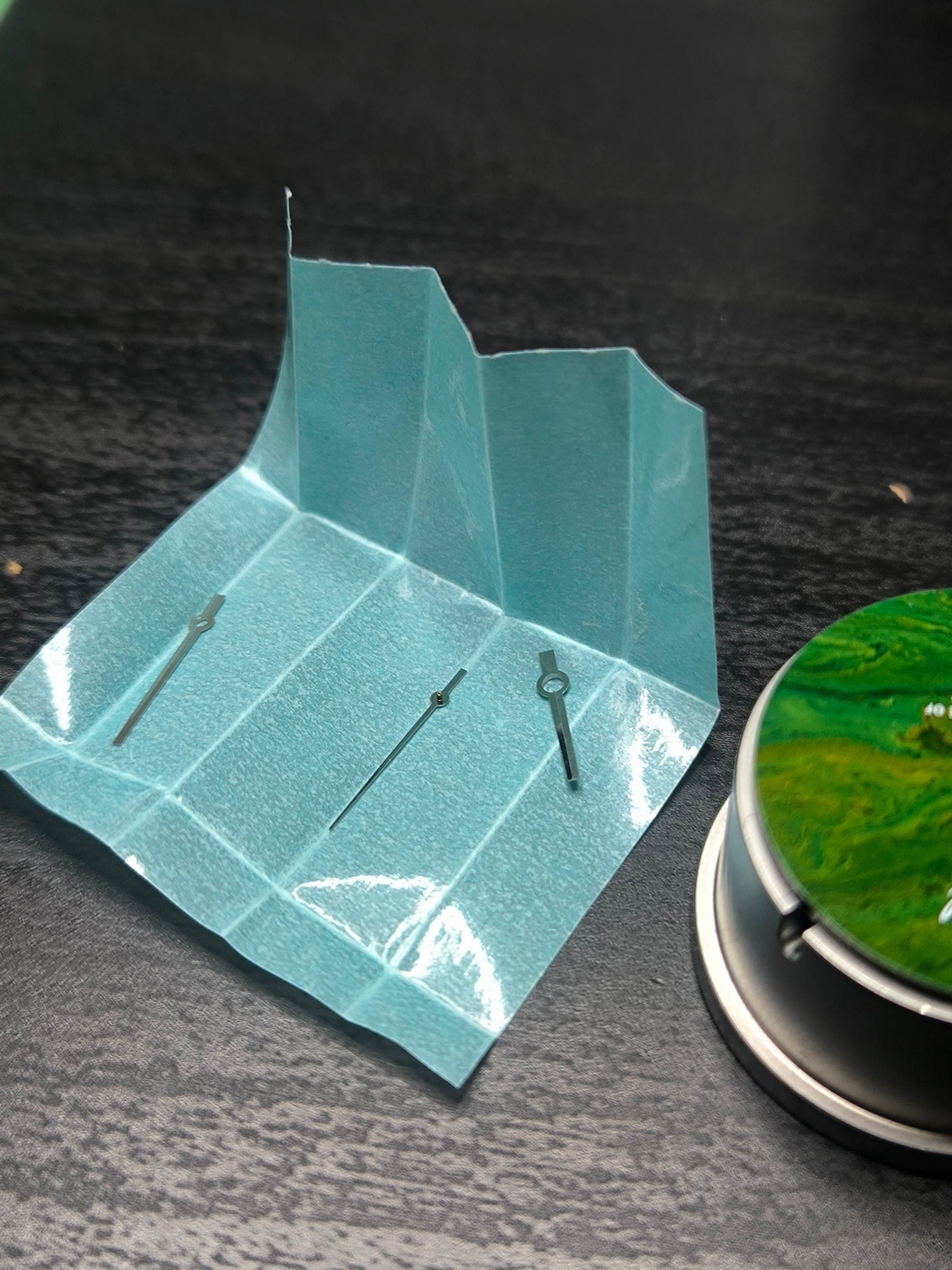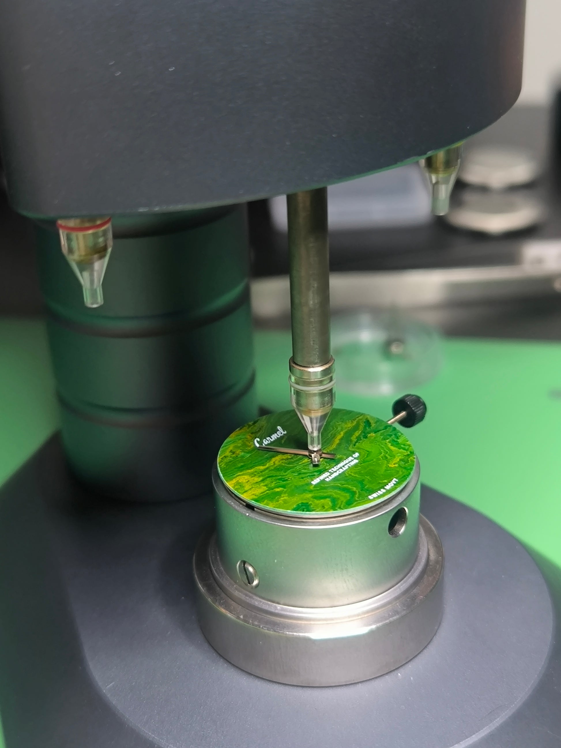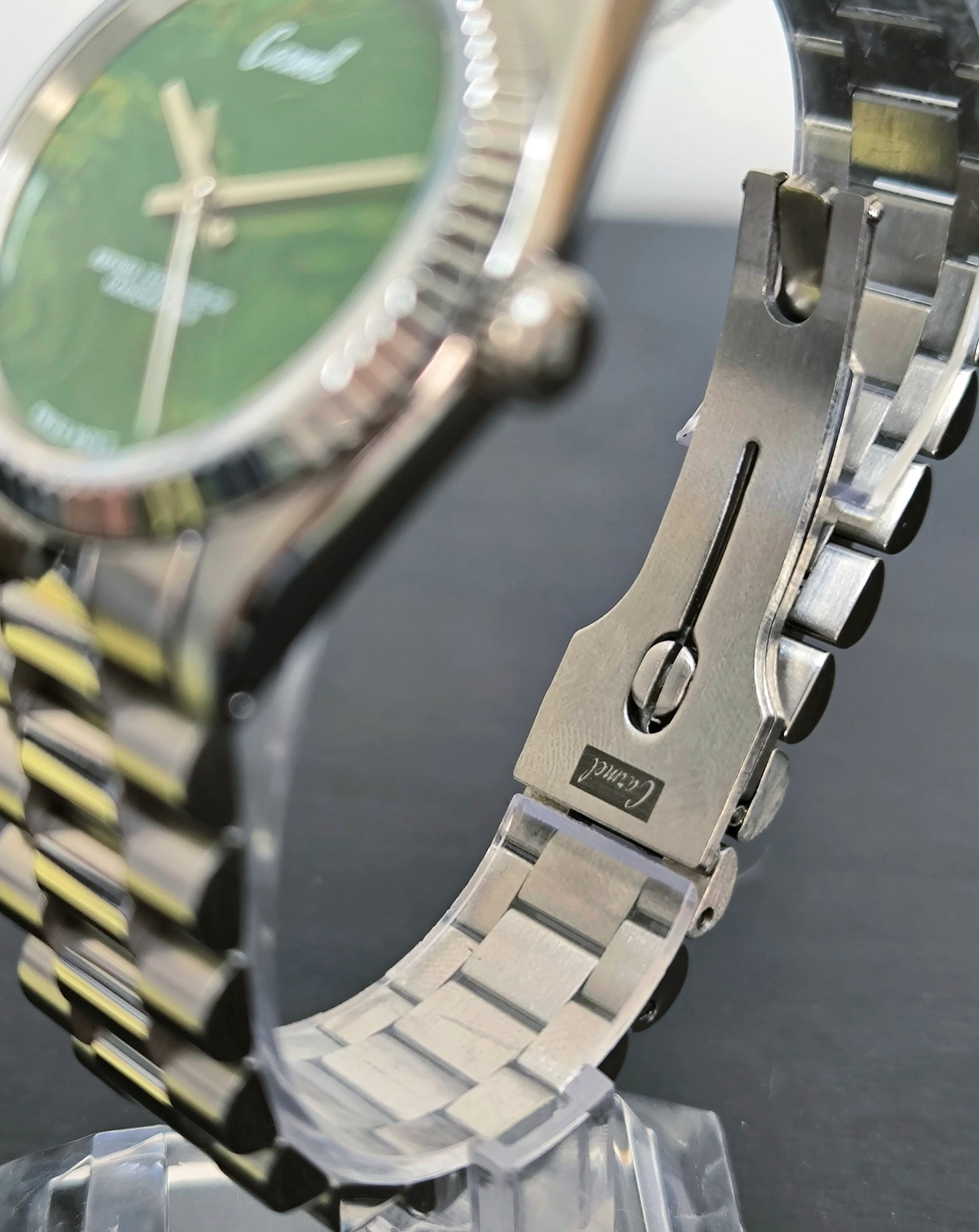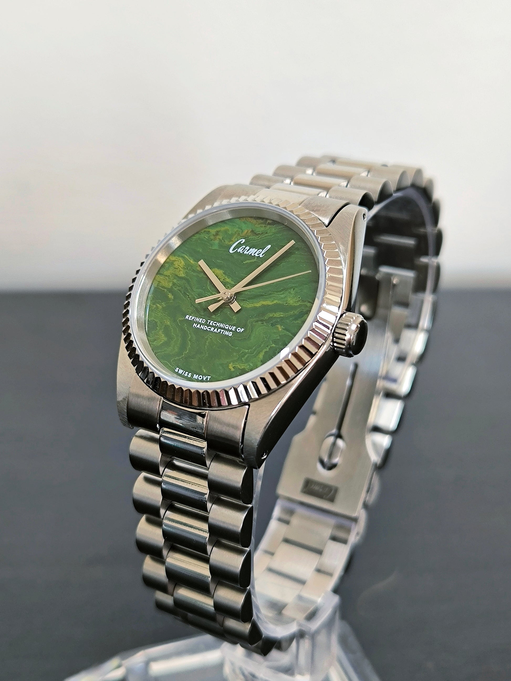 Its dial is crafted from natural muscovite, manually finished in my workshop. This rare gem is renowned for its vibrant green tones and shimmering reflections. The natural veins within the stone create delicate variations and depth, evoking the brushstrokes of an impressionist painting, making each dial truly one of a kind.